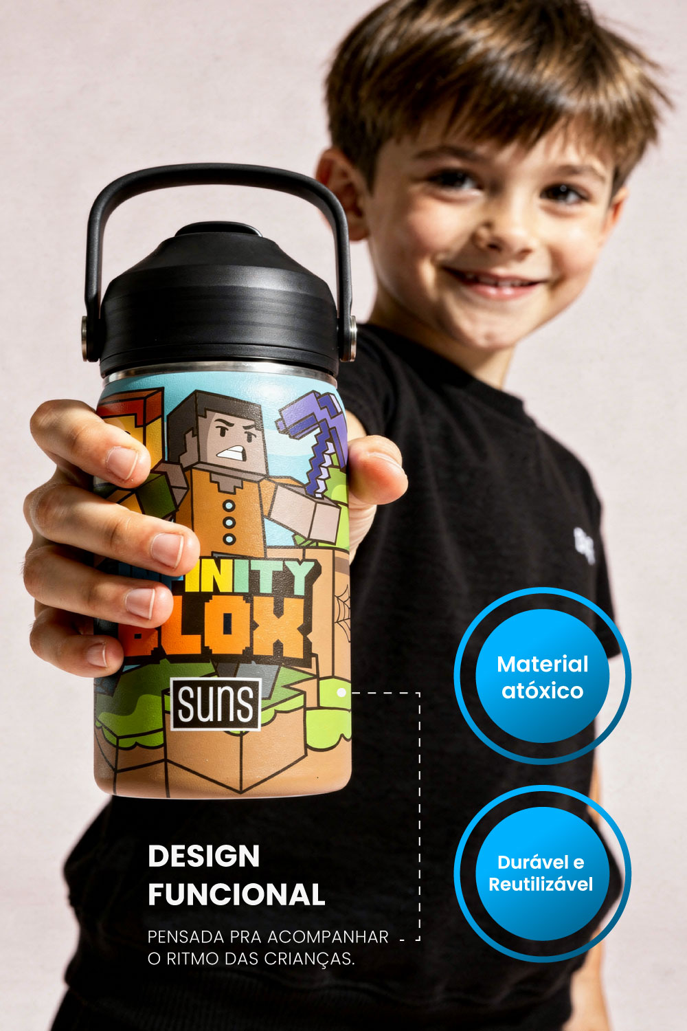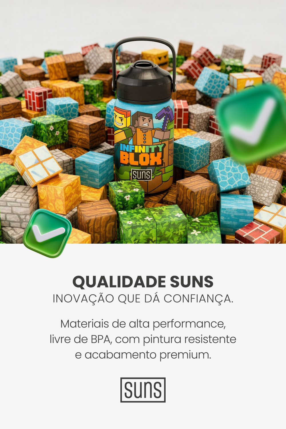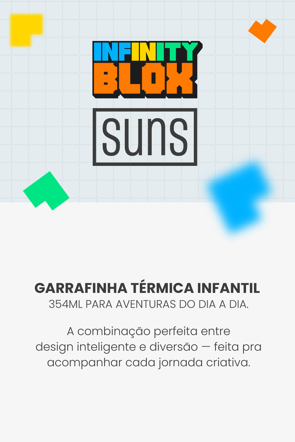 A Garrafinha Térmica Infantil InfinityBlox SUNS foi criada especialmente para crianças cheias de energia e imaginação. Inspirada no universo criativo dos blocos InfinityBlox, ela une design lúdico, qualidade premium e praticidade para acompanhar os pequenos em qualquer aventura.
