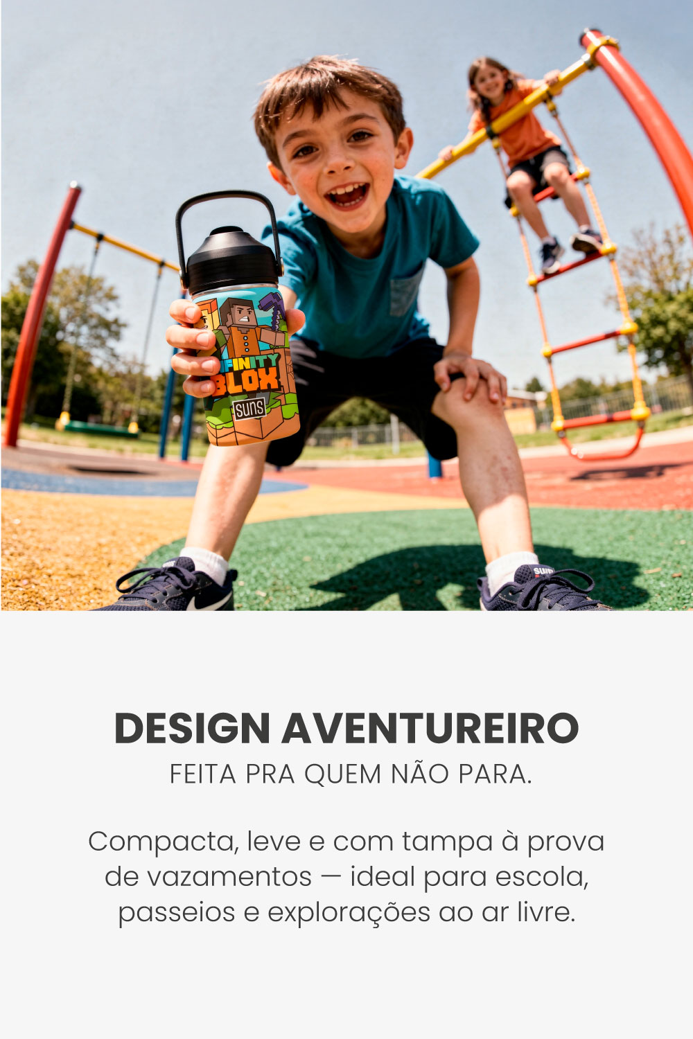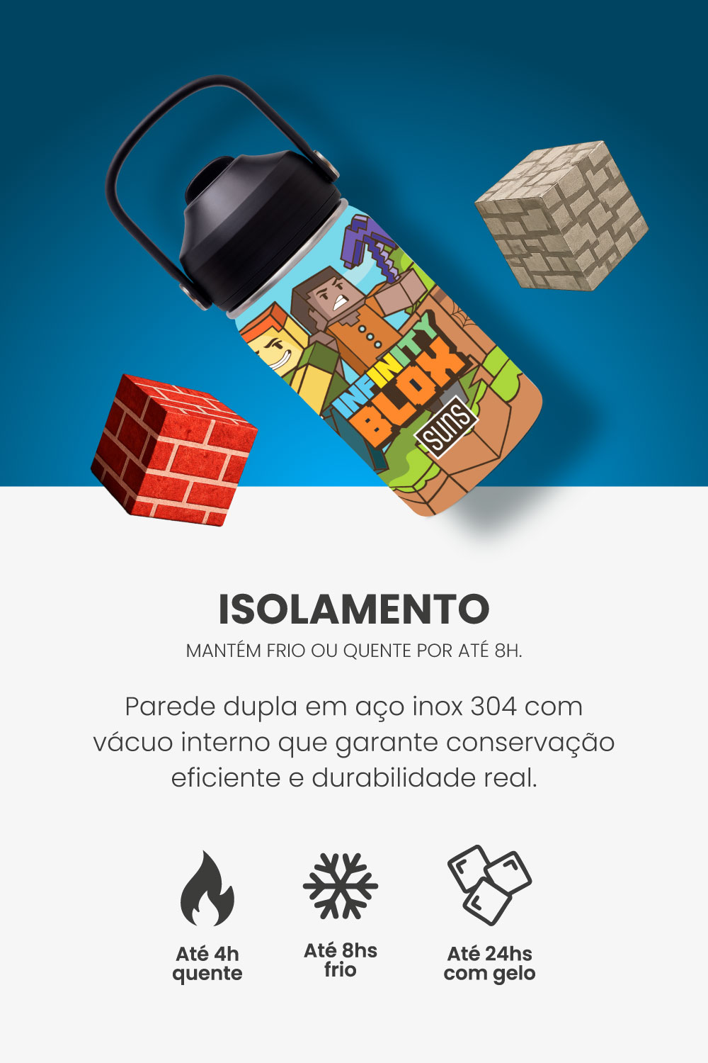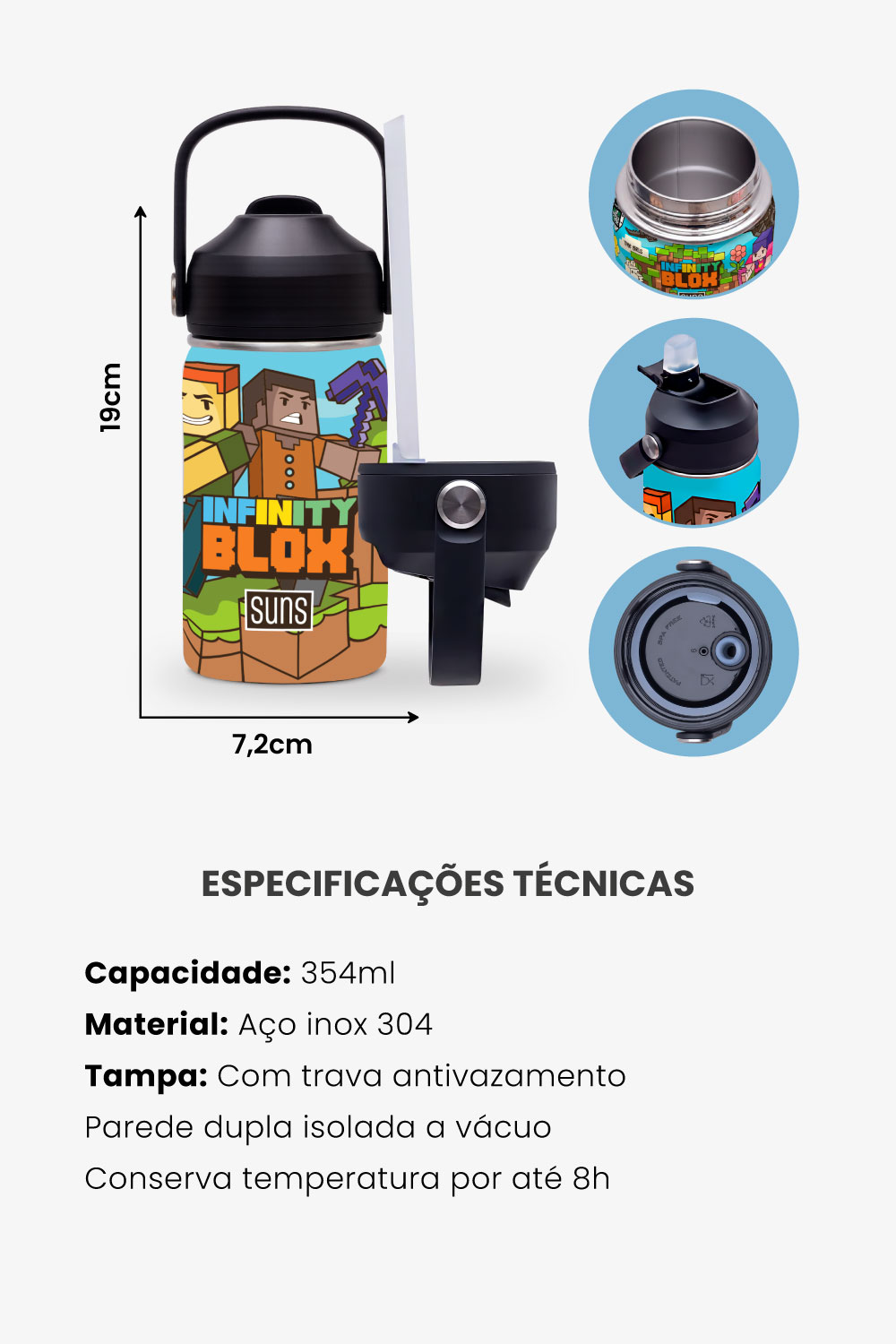 A Garrafinha Térmica Infantil InfinityBlox SUNS foi criada especialmente para crianças cheias de energia e imaginação. Inspirada no universo criativo dos blocos InfinityBlox, ela une design lúdico, qualidade premium e praticidade para acompanhar os pequenos em qualquer aventura.
