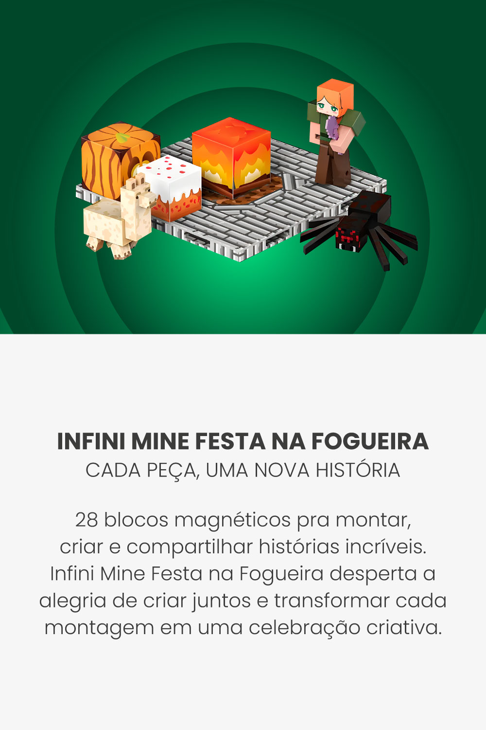 O Infini Mine – Festa na Fogueira é um kit criativo com 28 blocos magnéticos de 2x2cm, ideal para crianças que adoram transformar peças em aventuras. Inspirado em noites de acampamento e celebrações sob as estrelas, este conjunto é perfeito para montar barracas, fogueiras, personagens ou qualquer estrutura que a imaginação permitir.