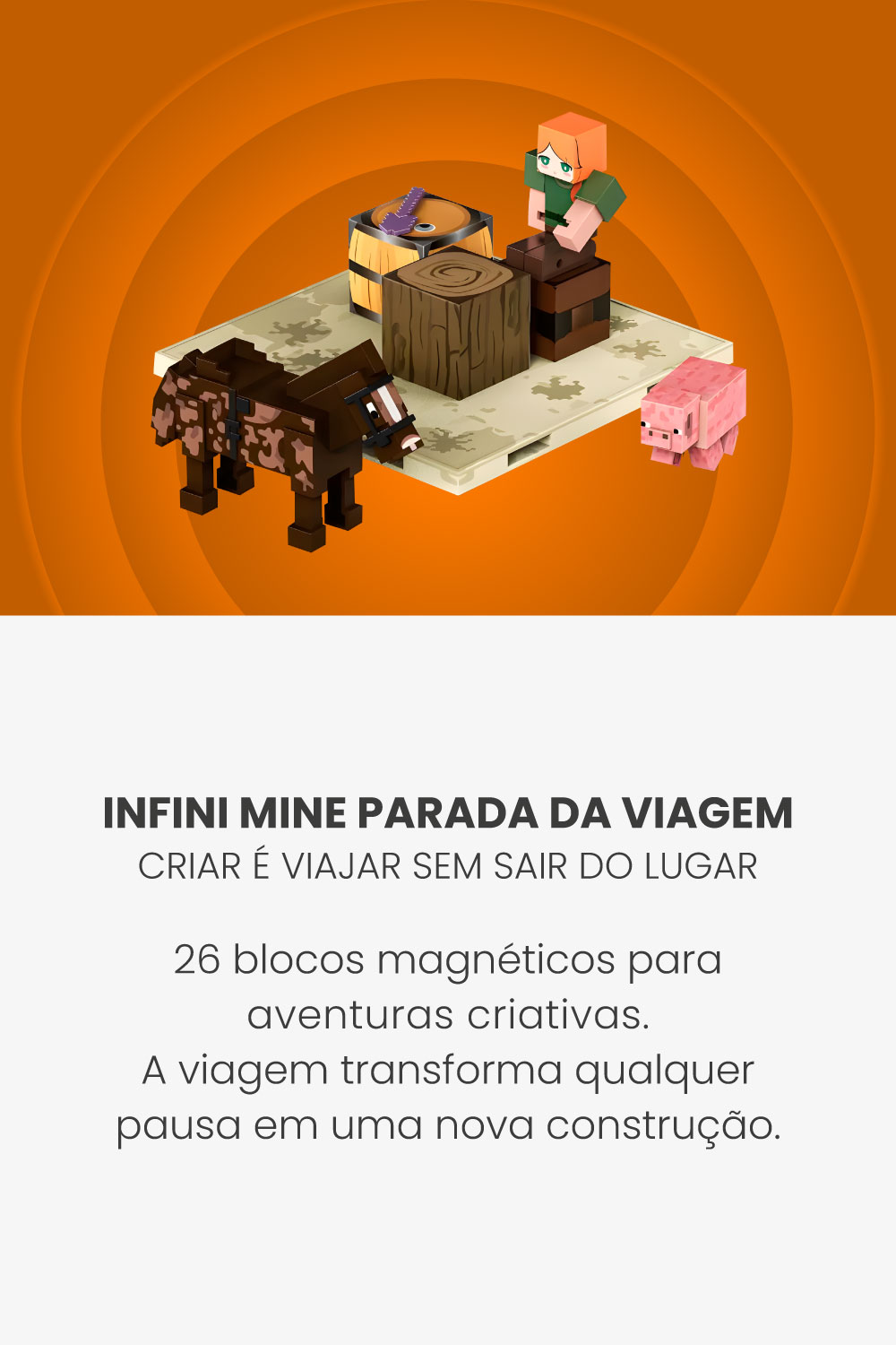 O Infini Mine – Parada da Viagem é um kit compacto com 26 blocos magnéticos de 2x2cm, ideal para crianças que estão começando a explorar o mundo da construção criativa. As peças se conectam com facilidade, permitindo montar cenários, estruturas e histórias com liberdade total — sem frustração e sem regras fixas.