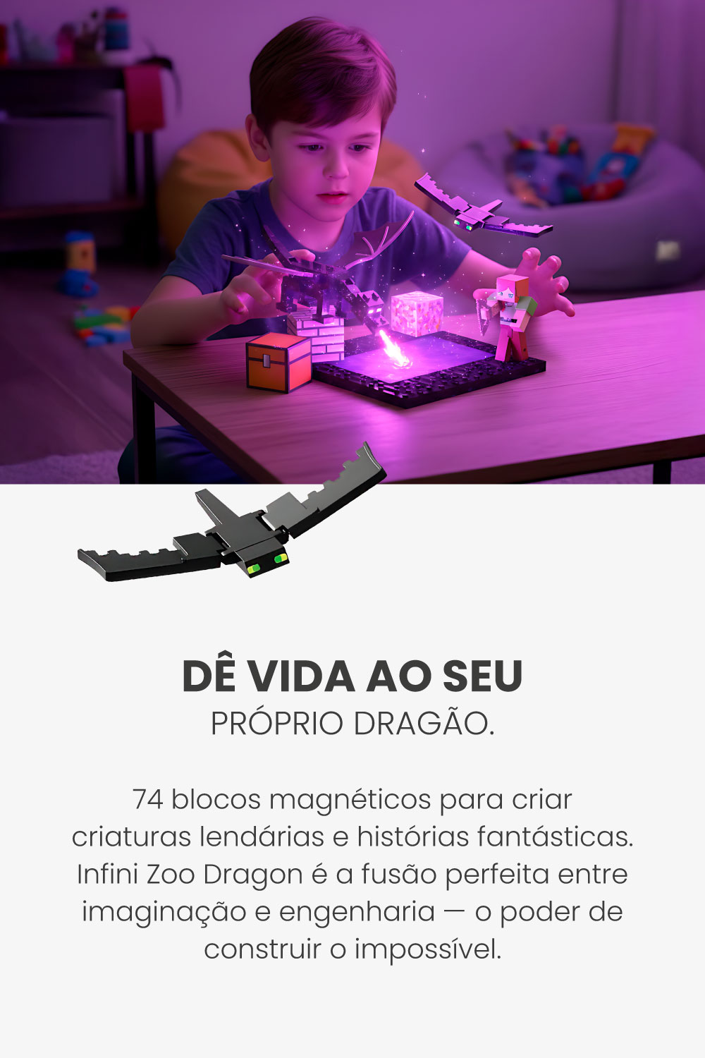 O Infini Zoo – Dragon é um kit com 74 blocos magnéticos de 2x2cm, ideal para crianças que amam unir o mundo animal com o universo da fantasia. Com visual inspirado em criaturas lendárias, o brinquedo permite construir dragões, habitats mágicos ou qualquer estrutura que a imaginação mandar.