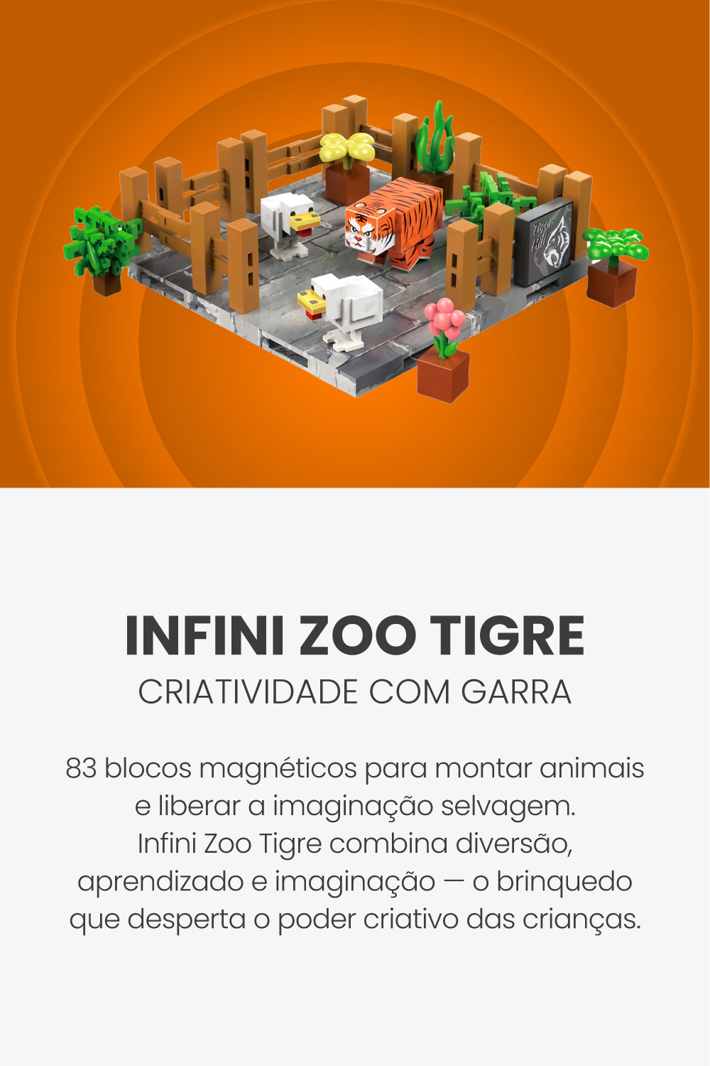 O Infini Zoo – Tigre é um kit com 83 blocos magnéticos de 2x2cm, criado para crianças que amam explorar o mundo animal de forma criativa. Com design inspirado na imponência dos tigres, este brinquedo educativo oferece liberdade para construir o animal, seu habitat ou qualquer estrutura imaginada.