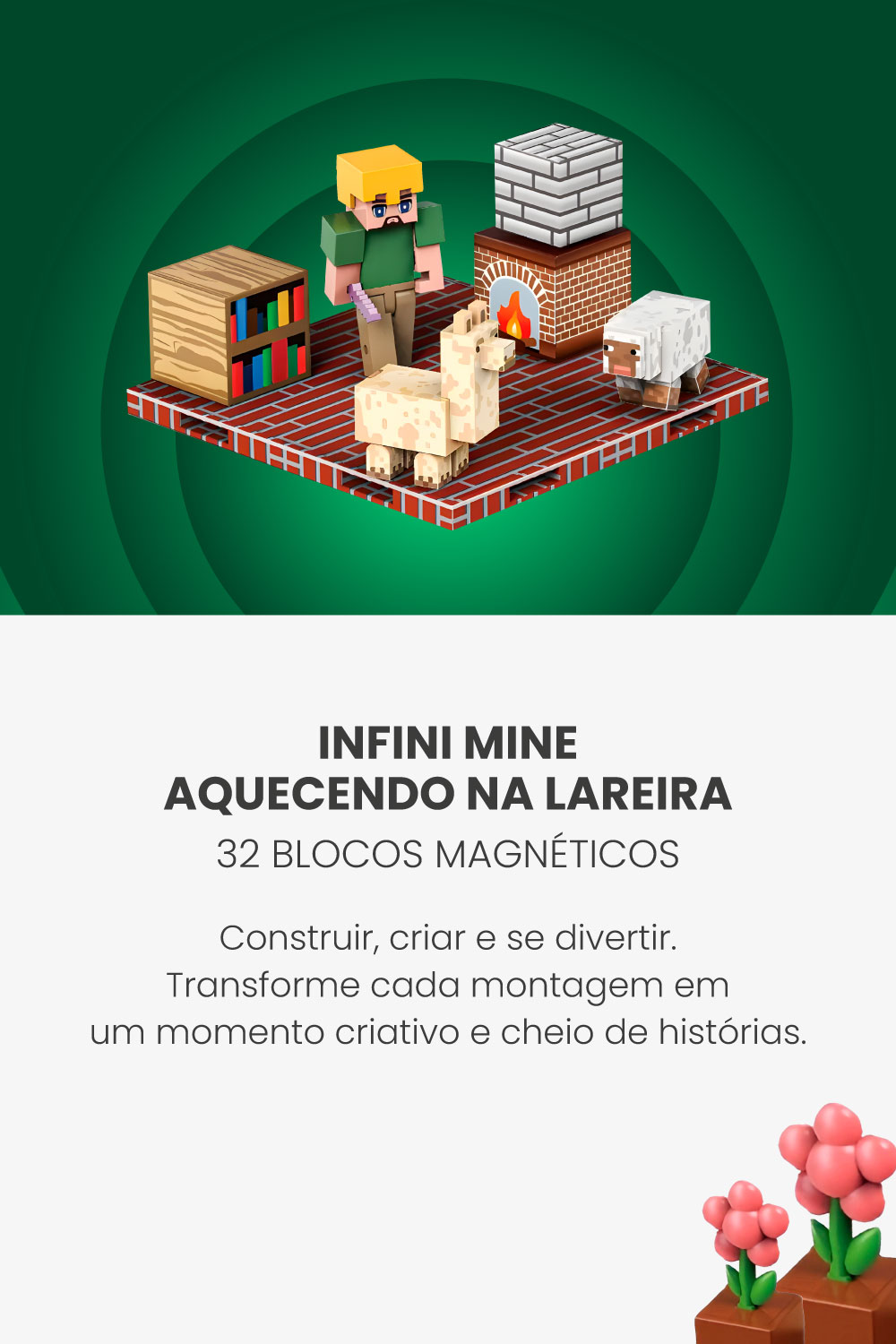 O Infini Mine – Aquecendo na Lareira traz 32 blocos magnéticos de 2x2cm que se conectam com facilidade para formar cenários acolhedores, estruturas lúdicas ou qualquer coisa que a imaginação mandar. Inspirado em momentos de pausa e tranquilidade, este kit combina o visual tech da linha com um toque de aconchego.